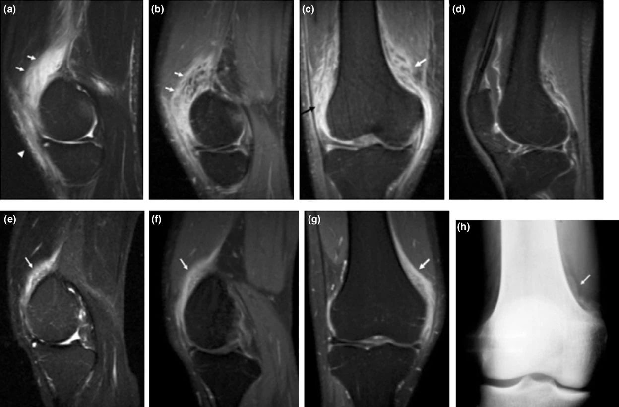 早期异位骨化:该患者颅脑损伤并且合并膝关节创伤,首次检查(a-d)股内侧肌周围T1高信号,皮下脂肪水肿,压脂呈花边样改变;3 周后复查(e-f)病灶内层不均匀强化,平片可以看到骨化及骨膜反应。