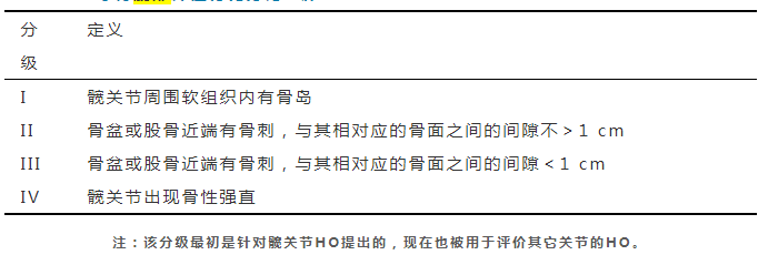 对HO临床诊断、治疗、预后判断有指导意义的分级,比较公认的有三类:Brooker的X线HO 分级;Garland 脑损伤分级,该法对判断HO发生或复发的倾向有意义;Hastings和Graham 的肘关节HO 功能分级 。