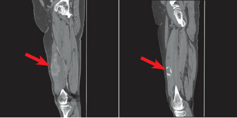 CT 检查:左图异位骨化最初表现为软组织肿块,周围组织水肿,肿块充血周边密度增高,右图患者 4 个月后复查可见局部软组织机化变厚,肿块较前减小但周围见环样骨化。