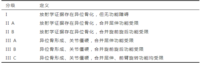 Hastings和Graham根据临床和影像学表现,将肘关节异位骨化分为3级。