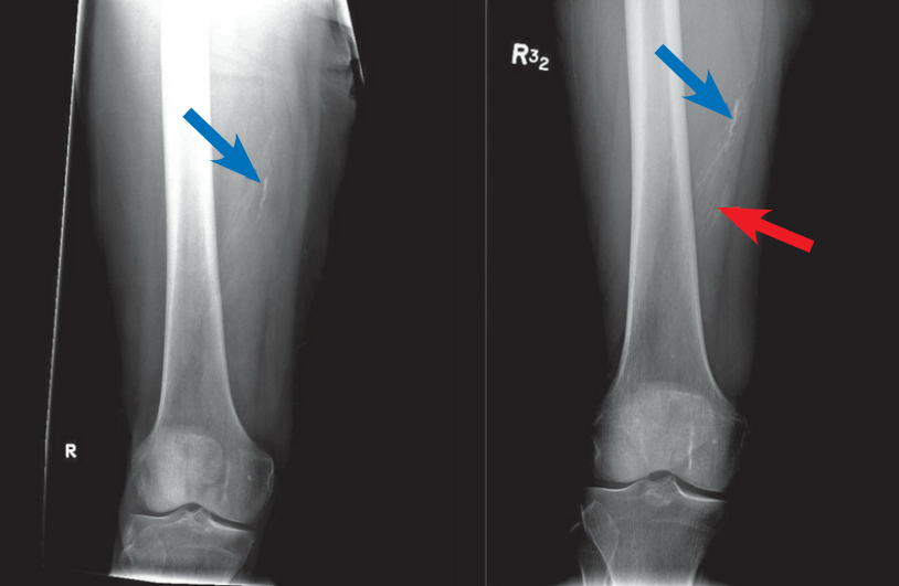 左图:X 线显示线状钙化影 (左蓝色箭头)。右图:随访 4 个月,可见钙化增多 (红色箭头),符合异位骨化。
