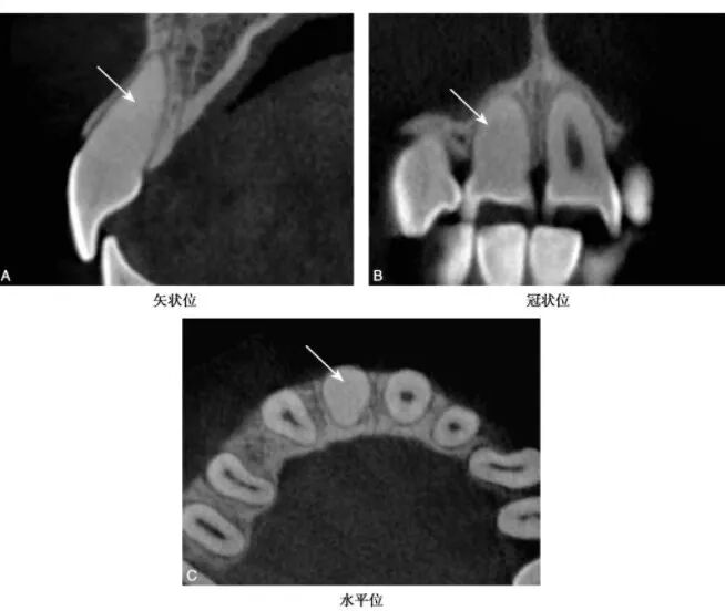 CBCT示A1髓室、根管正常影像消失,呈均匀近牙本质密度影(白色箭头)