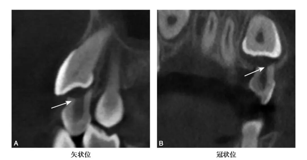 CBCT示女,10岁,BⅢ牙根吸收,B3牙胚位于其根方(白色箭头);