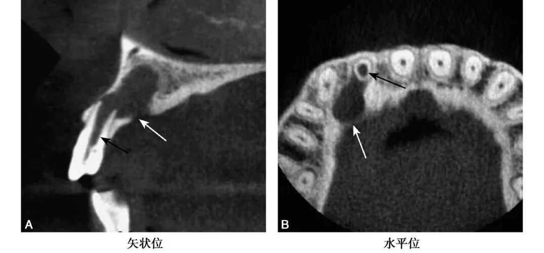 CBCT示A2根管明显增大,管壁变薄(黑色箭头),根尖孔未闭合,根尖腭侧骨质吸收明显(白色箭头);
