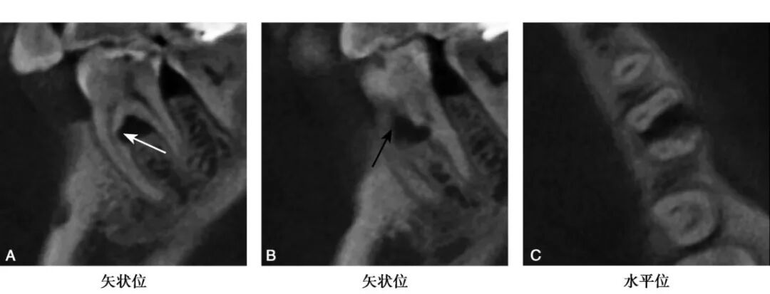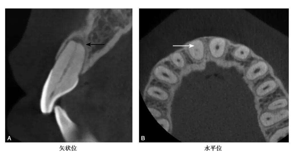 CBCT示A1根尖吸收变钝(黑色箭头所示),牙髓钙化致根管变细(白色箭头示);