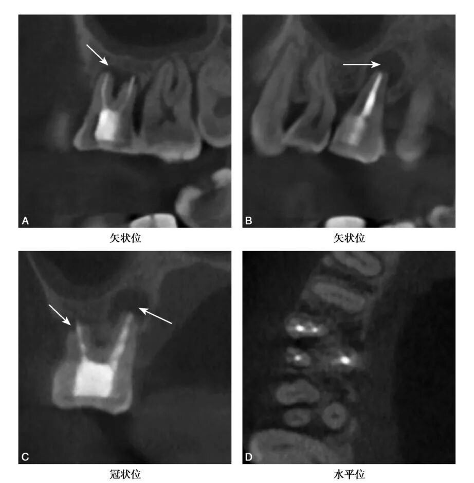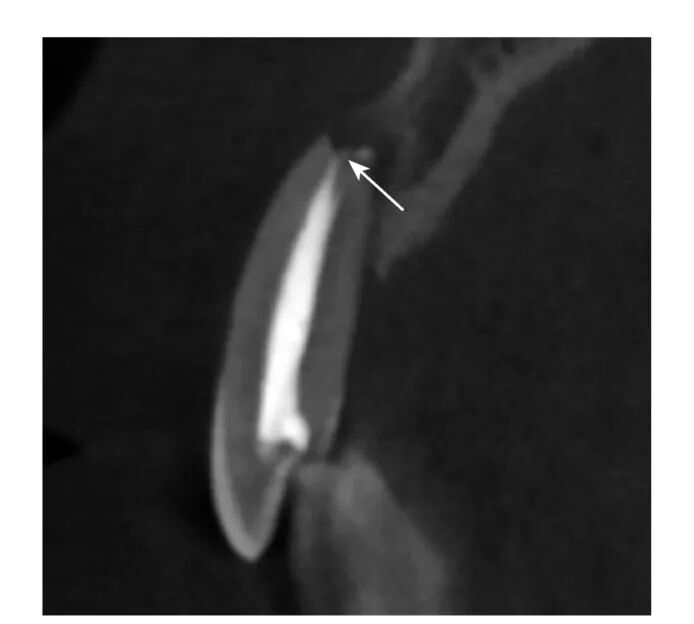 CBCT示A6根尖见低密度影(白色箭头),根管内见根充影像,根尖吸收变钝;
