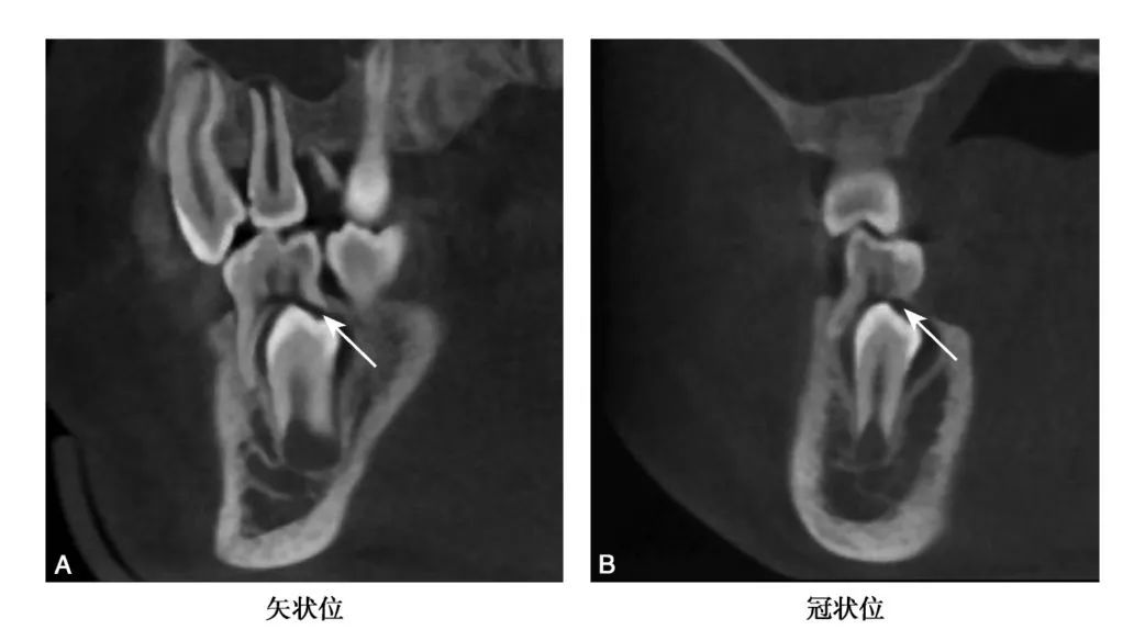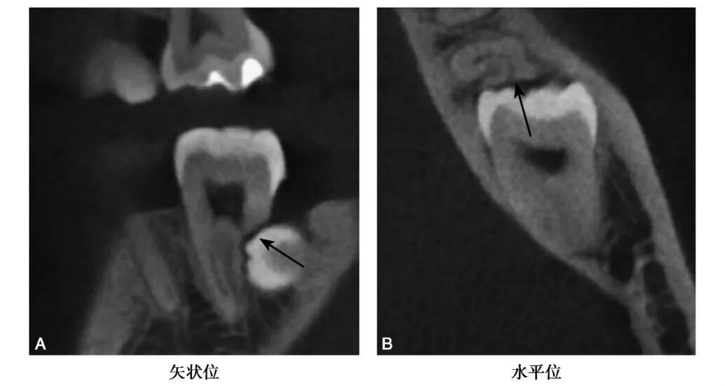 CBCT示D6根分叉处骨质缺损,近中根远中面(白色箭头)、远中根近中面(黑色箭头)见凹陷形低密度影;