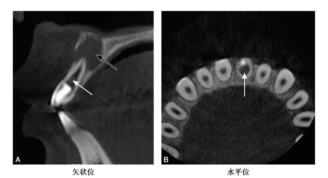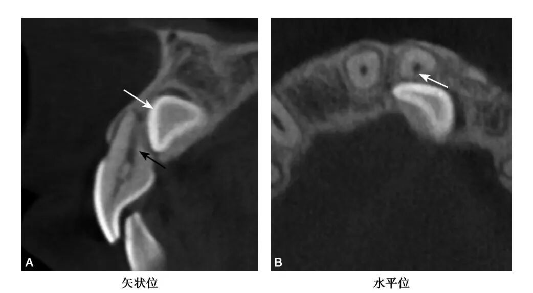 CBCT示B3异位埋伏阻生(白色箭头),B1牙根腭侧被压迫吸收(黑色箭头所示),B1髓腔内见髓石;