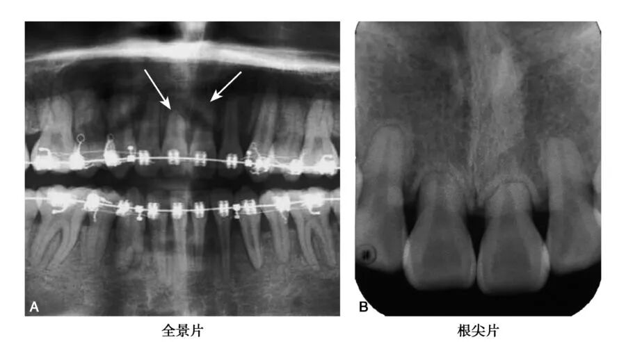 A. A1、B1牙根吸收变短; B.托槽去除,A1、B1牙根吸收变短(白色箭头);