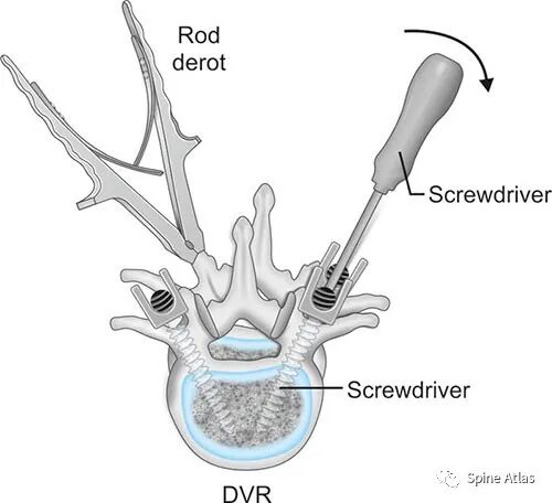 侧弯顶椎的固定钉,凸侧用套筒+T柄,凹侧大力持棒钳,同时转向凸侧可以椎体直接去旋转(凹侧螺钉容易外壁切割,凸侧螺钉容易内壁切割)。骨质疏松者可以在顶椎附近三个节段椎体联合去旋转。
