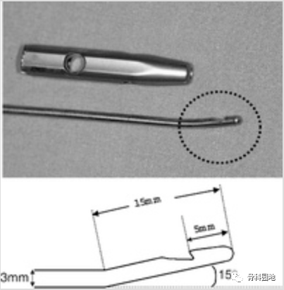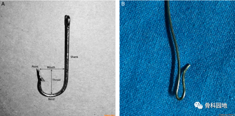 从长骨干取除断裂的髓内钉仍然是一个棘手的问题。本文介绍一种方法,该方法在技术上比文献中描述的其他方法要求低。此方法类似于钓鱼,这是一种通过鱼钩钓鱼的方法。在这种方法中,断裂的钉子在透视引导下钩住,并通过由不锈钢丝制成的钉钩以逆行方式取回。它无创地去除断裂的钉子,需要进一步暴露。1.首先钩子有一个宽阔的嘴,一个窄的弯曲(图A,B)。