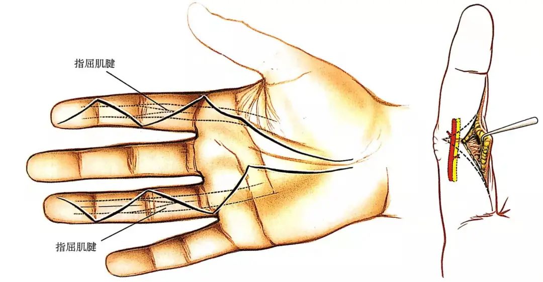 - 皮肤切口可延长成掌侧“Z”形切口显露任一手指,可完全显露其掌侧结构。