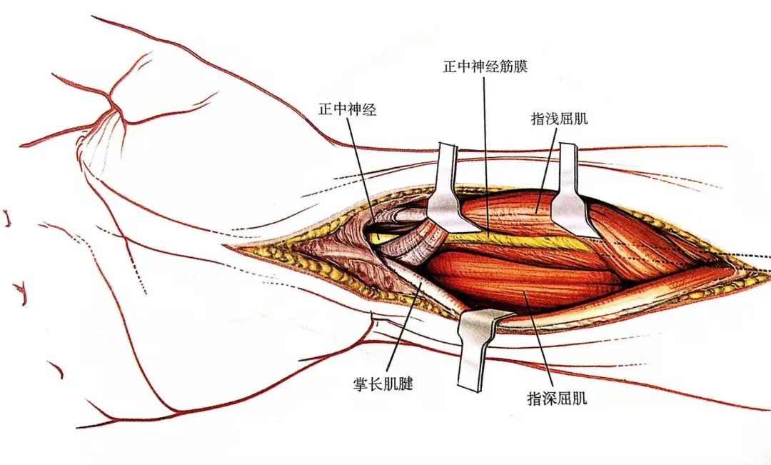 - 正中神经通过深筋膜附着于指浅屈肌的深面。因此牵开指浅屈肌,正中神经也一并被牵开。