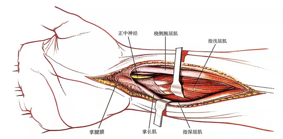 ▲ 切开掌长肌和桡侧腕屈肌间的前臂筋膜,显露指浅屈肌及其肌腱
