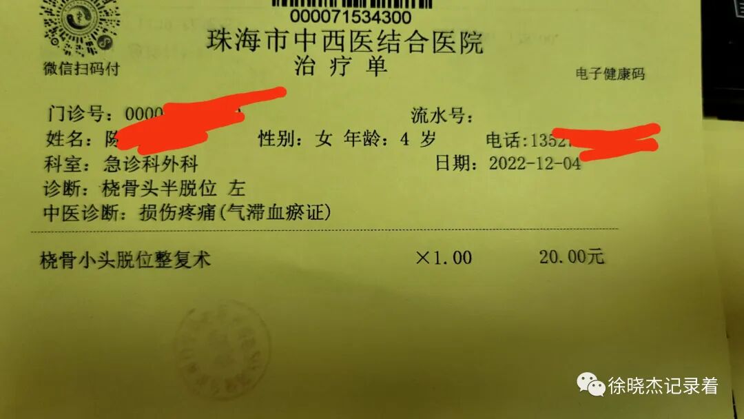 第15位患者是01:11就诊的,四岁小女孩,小女孩咳嗽,12点多睡觉的时候她外婆拉她手腕起来喝药,出现了左肘疼痛活动受限。我外婆考虑是脱臼了,在家里自己拉扯揉捏好不了,爸爸妈妈带着过来医院就诊。不到一分钟时间,20块钱,搞定回家。睡梦中的小女孩哭的有点厉害……不过复完位之后,他的手又活动自如了……