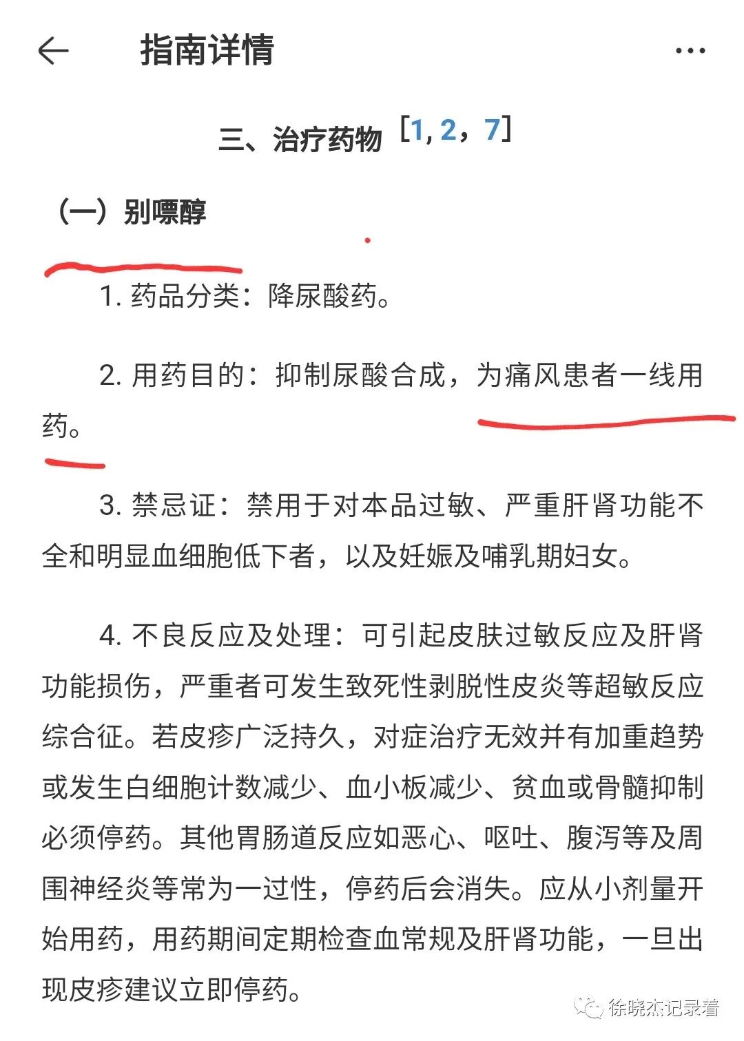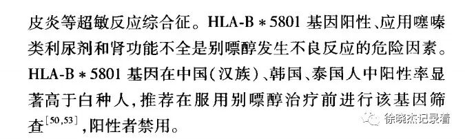 第2位是早上10:18的患者,芳龄31,有痛风,肾结石,血尿酸最高700,短暂服用过一盒非布司他。突发左膝肿痛,活动受限一天就诊。体格检查发现左膝局部肿胀明显,压痛,皮温高,浮髌试验阳性。膝关节超声检查提示股骨软骨表面见双轨征,膝关节积液,考虑通风性关节炎。像这种情况我建议他抗炎止痛治疗,同时可以降尿酸治疗。降尿酸治疗的话首选别嘌醇,但是因为之前没有吃过别嘌醇,所以需要先做一个HLA -B*5801基因检测,患者即刻拒绝,要求服用消炎镇痛药,表示自己再去买非布司他吃。在 2020 年 ACR 的痛风治疗指南中,别嘌醇被作为一线降尿酸药物推荐,但由于在黄种人中,别嘌醇因可引发致死性超敏反应,令不少医生对这一药物望而却步,甚至有医生表示:「不作第一个处方别嘌醇的医生」但是,包括今年新发布的《痛风基层合理用药指南》在内的多个国内指南也推荐别嘌醇为一线降尿酸药物。
