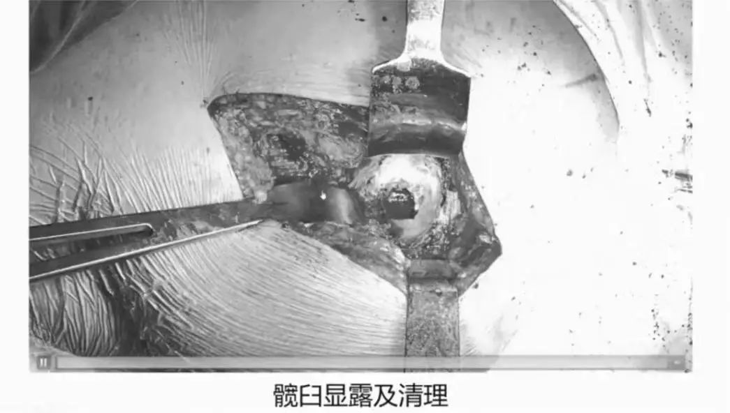 切开皮肤、皮下组织、阔筋膜,显露外旋肌群,以纱布压迫止血,注意术后取出。在臀中肌和臀小肌处放置板钩,切断梨状肌、短外旋肌群,用电刀切开时以骨刀边切边剥离,此时可能会涉及旋股外侧动脉的分支,注意用电凝进行彻底止血,必要时可进行结扎。