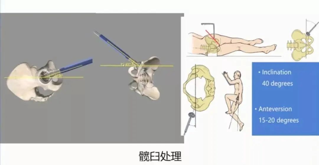 标准的髋臼磨锉应保持外展35度-45度,前倾12度-20度。对于股骨颈骨折或股骨头坏死等髋臼没有明显病变的患者,髋臼磨锉时平行于髋臼缘即可。如果存在髋臼发育不良,可先将髋臼锉立起来,使其垂直于身体纵轴,然后再按照标准角度,进行外展和前倾的调节。