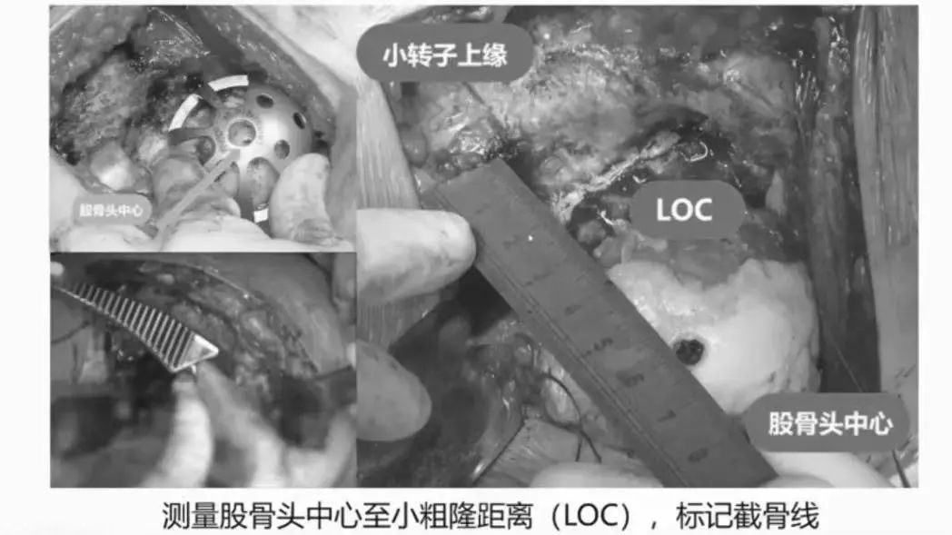 脱位髋关节,然后进行股骨颈清理,包括股骨截骨部位。测量股骨头中心至小粗隆的距离(LOC),标记截骨线,一般位于小粗隆上1.5cm左右。