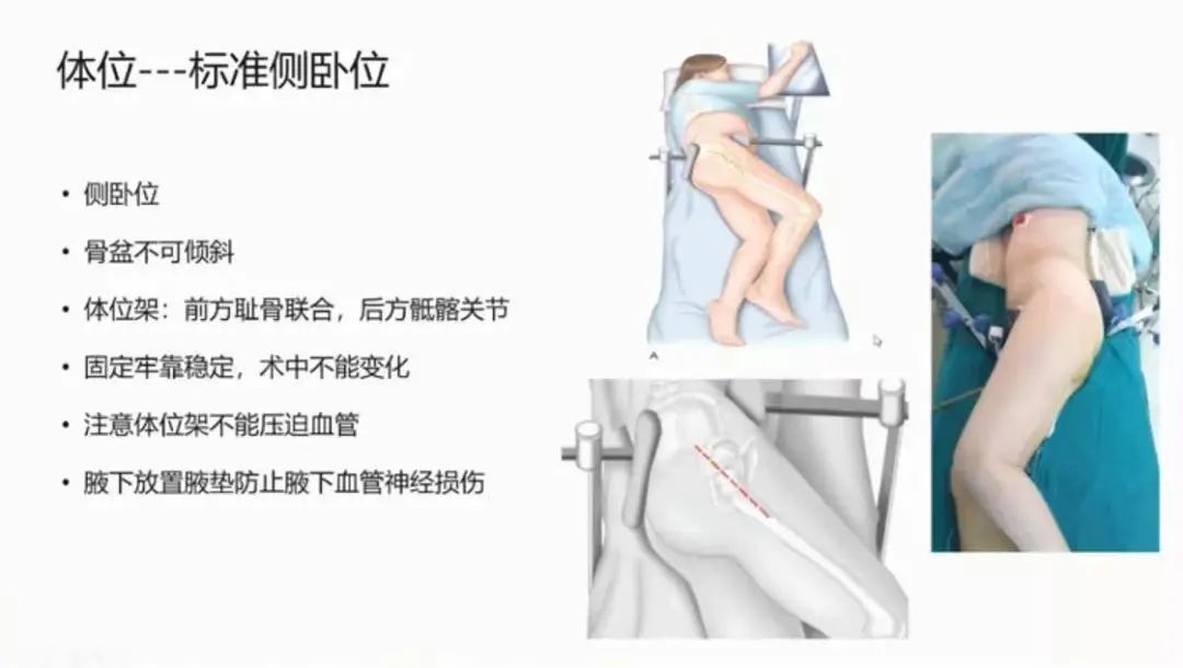 侧卧位,骨盆不可倾斜,体位架前方固定于耻骨联合,后方固定于骶髂关节。固定牢靠稳定,术中不能变化。