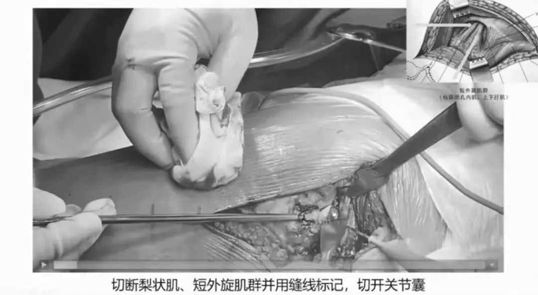 细节:切开外旋肌群时不要一下切到底,而应在关节囊的表面进行分离,逐层切开以便于术后的分层缝合。此外,术中在进行显露时需要分别对外旋肌群和关节囊用缝线进行标记,术后进行分层缝合。