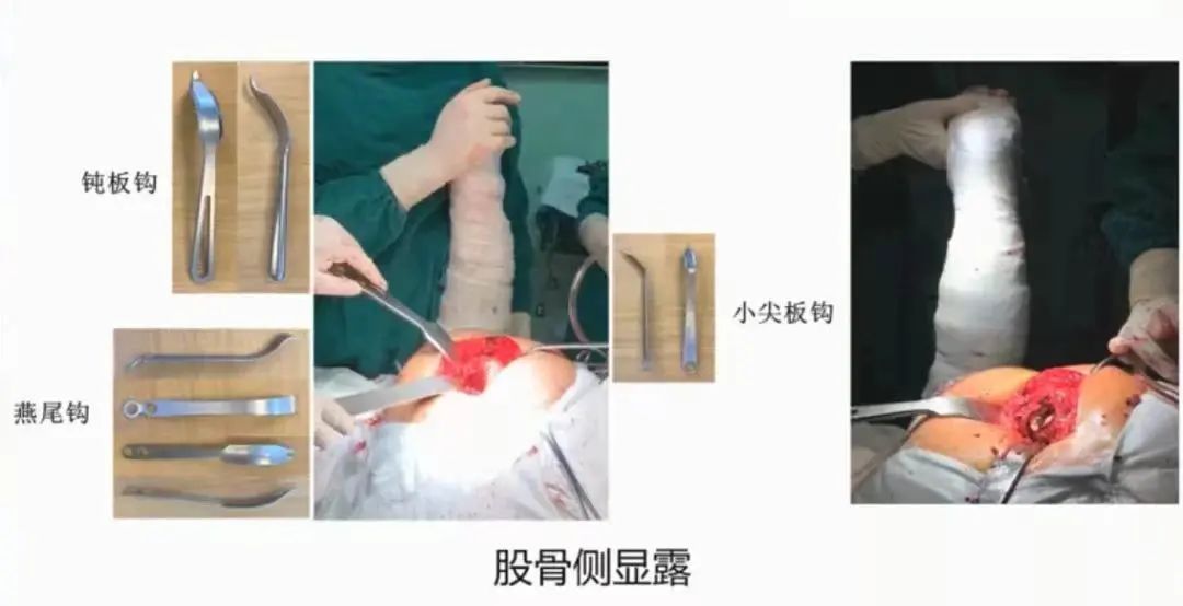 助手将患肢脚朝天,并将股骨近端推出来,将燕尾钩置于股骨颈截骨处的下方,将钝拉钩放置于小粗隆下方,这样便可以完全显露股骨近端。