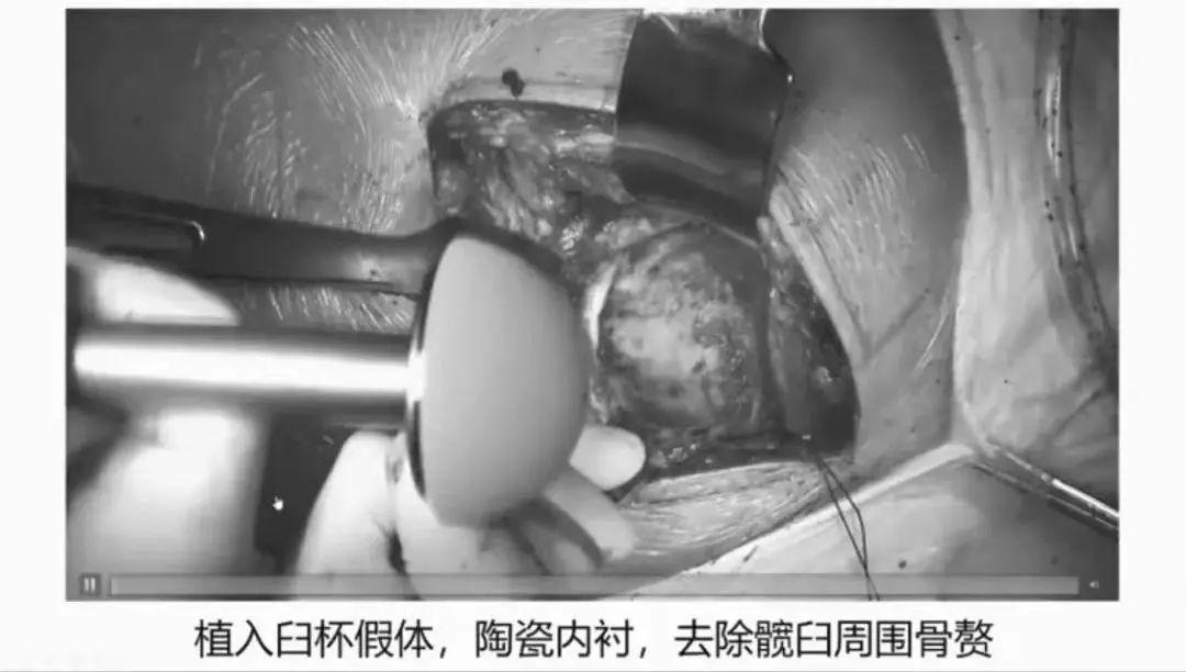 沿试模方向置入臼杯假体,并确定臼杯是否安放到底,然后检查稳定性,置入髋臼内衬。