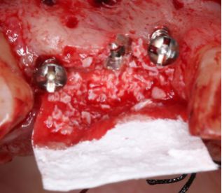 自体骨材料成骨作用好,但术后吸收多且快。而目前应用较多的异种骨Bio-oss成骨时间长,但替代率低,维持空间作用好。大量文献证实二者结合使用的良好效果,关于二者的最佳比例尚无定论,推荐GBR时常规在Bio-oss混入一定量的自体骨颗粒(常在术区附近获取,避免开辟第二术区)。植骨材料应按照理想骨轮廓与外形植入,且鉴于GBR术后会发生骨量减少,建议过量植骨。为了创造受植床良好血供,促进血管化,可行骨皮质区去皮质化,创造出血滋养孔。