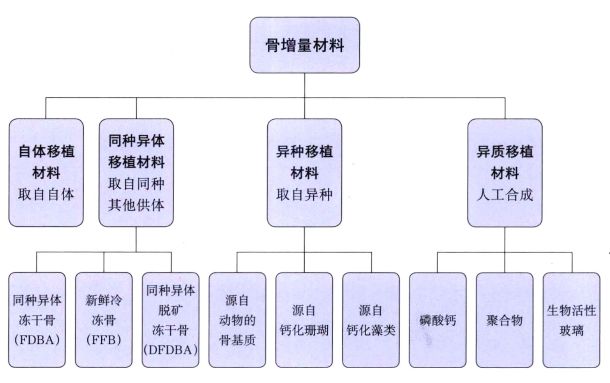 骨移植材料可大致分为自体骨,同种异体骨,异种骨及人工合成骨;骨再生过程中骨移植材料依据其特性可能发挥以下作用包括:骨生成(活的成骨细胞产生新骨)、骨诱导(引导成骨细胞的分化生成)及骨传导(使骨沿材料生长)