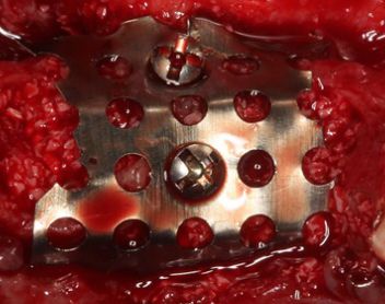 不可吸收膜的空间维持能力强于天然胶原膜,但由于未进入国内市场,此处不再赘述。应用较多的可吸收膜包括Bio-Gide生物膜(Geistlich,瑞士),海奥生物膜(烟台正海技术),它们亲水性强,生物相容性好,组织整合作用快,易于操作,但吸收较快(2-4w),维持成骨空间能力较弱。在覆盖植骨材料前应预先按照植骨区域形状修剪屏障膜,植骨区屏障膜边缘建议盖过植骨材料2-3mm,且应与术区获得良好贴合,从而达到理想的密封效果。鉴于可吸收膜较弱的空间维持能力,在植骨区域较大,植入骨粉量多,骨缺损的形态为不利型骨缺损,此时维持稳定的成骨空间便较为困难。