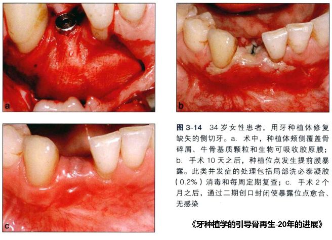 要求患者常规应用抗生素数日,洗必泰漱口。早期嘱患者复查,若出现小范围膜暴露,需加强伤口区消毒,若出现大范围膜暴露甚至伤口处明显感染,则可能需要伤口处的清创及重新行GBR。