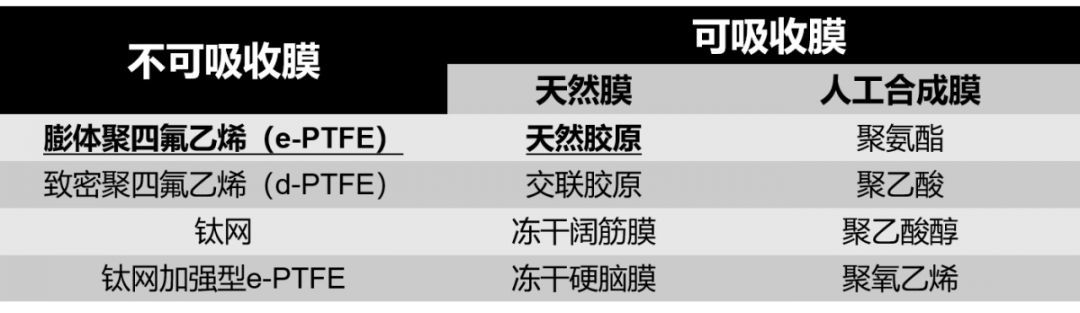最早应用于GBR的屏障膜是e-PTFE不可吸收标准膜,主要产生的问题是需要二次手术去除不可吸收膜及术后可能的膜暴露不得不去除并影响最终的成骨效果等。随后导致了对可吸收膜的研究并成功应用,其中就包括目前在中国地区应用最为广泛的Bio-Gide非交联猪胶原膜。目前应用于临床及处于研究中的GBR屏障膜主要有不可吸收膜(膨体型/致密型/钛网增强聚四氟乙烯膜),可吸收的天然膜(天然/交联胶原膜)及人工合成膜等。