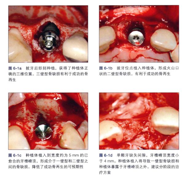 同期植入植体要求能将植体植入正确的以修复为导向的三维位置,并获得一定的初期稳定性。若不能获得足够的初期稳定性或者不得不以不理想的三维位置植入植体,则建议采用分阶段的种植修复方案。而且,若一次GBR的骨增量效果难以预期,采用同期种植后的修复效果难以预料,也不建议同期种植。