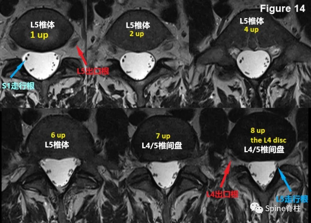 MRI从S1椎体层面向上连续扫描,至4up的L5/S1椎间盘水平。在2up处可以看到右侧关节突(白色箭头),3up中S1走行根刚开始从硬膜囊中发芽形成独立囊鞘。4up可明确看到L5/S1椎间盘。其实,从2up开始就看到部分L5/S1椎间盘。