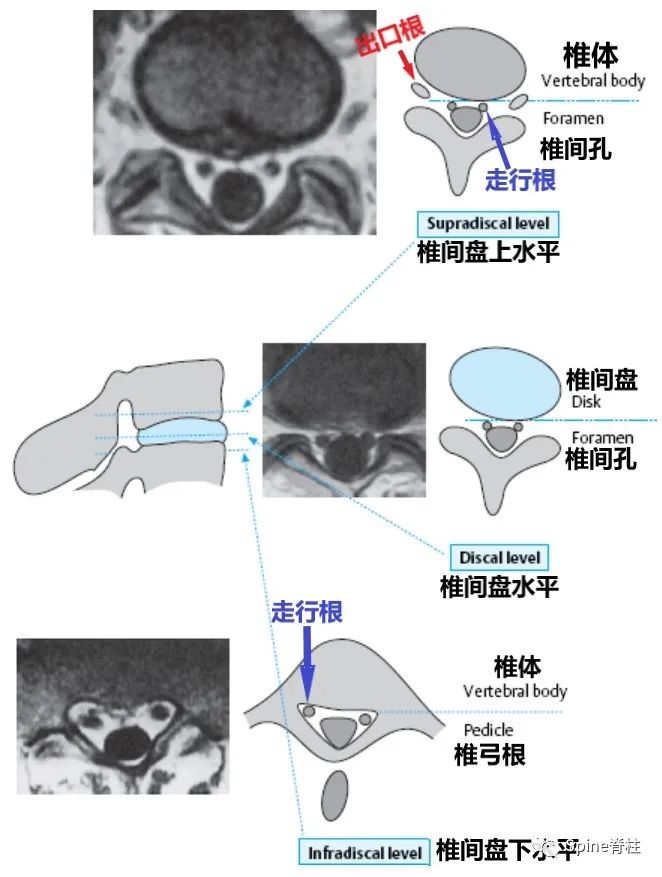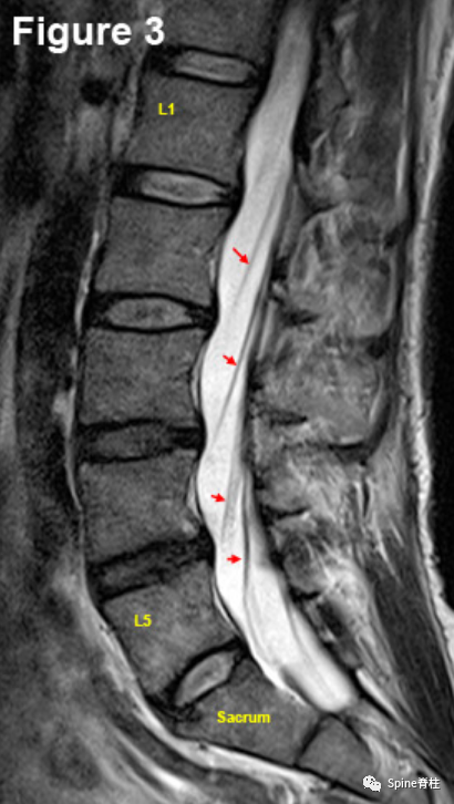 腰椎MRI旁矢状位(Para-Sagittal Region),在硬膜囊内可见走行根(红色箭头),但L5除外,它已从硬膜囊出芽(第3个红箭头)。