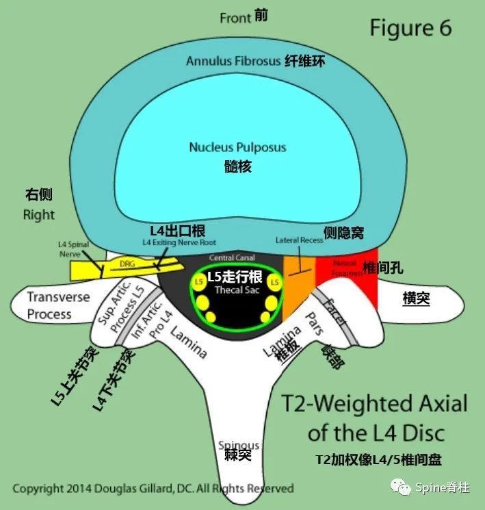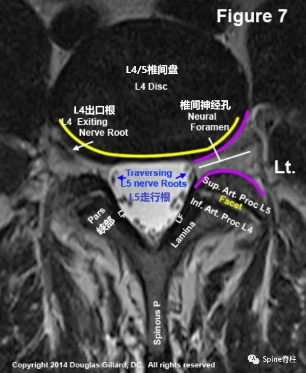 从L5/S1椎间盘层面继续向上,并连续扫描至L4/5椎间盘,此患者L4/5椎间盘呈黑椎间盘。注意标注的各出口根和走行根