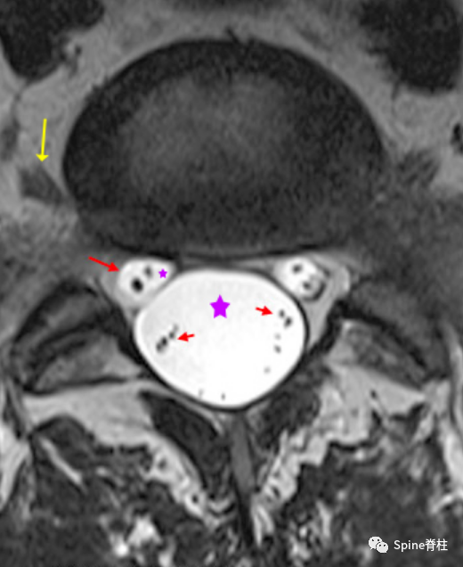 腰椎MRI的L5-S1椎间盘横断面。黄色箭头为L5神经根。可见巨大圆形的硬膜囊,充满脑脊液(大紫星和极亮的白色)。在2点和10点,可见S1走行根(左侧大红色箭头),其中也充满脑脊液(小紫星),也可看到S1走行根的感觉神经根和运动神经根。这三个圆形结构(硬膜囊和两个走行根)共同构成了“米老鼠”外观,典型通常仅在L5-S1水平,有时在L4-5水平也可见。