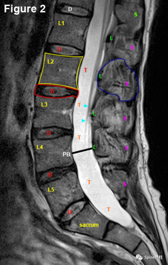 腰椎MRI正中矢状面(mid-Sagittal Region)。可见两种主要的骨结构:方形椎体(黄色轮廓)和后弓的棘突(蓝色轮廓和S)。棘突与椎板的连接构成后弓的前边界,后弓也形成中央椎管的后部。这被黄韧带覆盖(绿色L)。椎体和后弓之间的极度高信号空间(几乎纯白色)是硬膜囊(红色T),充满着脑脊液。黑线为椎体后部(PB)、椎弓根和椎板之间的距离,为椎管的直径。在正中矢状面中,马尾神经根通常不太明显(淡蓝色箭头),除非它们靠近神经孔(未显示)。位于5个腰椎椎体之间的是5个腰椎间盘(红色轮廓和D),它们承载身体80%的轴向载荷。