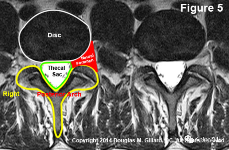 椎间盘水平T2加权像的横断面MRI片(Disc-Level T2-Weighted Axial MRI Image)。白色轮廓为椎间盘,绿色轮廓为硬膜囊和黄色轮廓为后弓。涂红的区域为椎间神经孔。