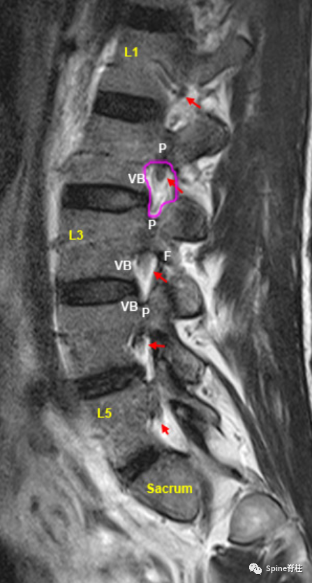 腰椎椎间孔矢状位(Foraminal-Sagittal Region)是一个位于旁矢状位外侧的区域,可很好的显示椎间孔的边界(粉红色圆圈):顶部和底部分别由上下椎弓根(P)组成。后边界由下位脊椎的上关节突组成,前边界由椎间盘和椎体(VB)组成。注意,椎间孔因高脂肪含量而呈高信号,而出口神经根(红色箭头)呈低信号。