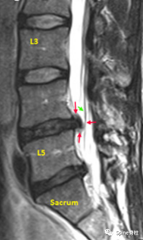 腰椎MRI旁矢状面(侧隐窝)可见L4-5椎间盘突出(红色箭头),接触到一个走行根,甚至将其推得有点偏离轨道(绿色箭头)