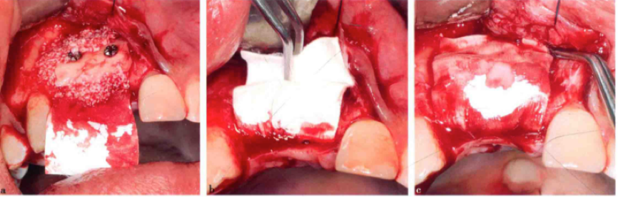骨块固定后,为防止移植骨块术后吸收,可在骨块表面覆盖低吸收率的骨替代材料和可吸收胶原膜。