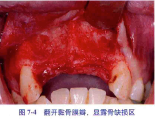 粘骨膜瓣的剥离及翻起过程中应注意保持其完整性,尽量在骨膜下剥离。上颌前牙区,往上需剥离到梨状口的下缘,露出部分鼻粘膜,在植骨后伤口关闭前做软组织松弛处理时,应避开此黏膜以免切透后导致植骨区与鼻腔相通。但在剥离至前鼻棘时,其上的软组织可不完全剥离,以免术后患者鼻翼变宽或鼻中线偏移。