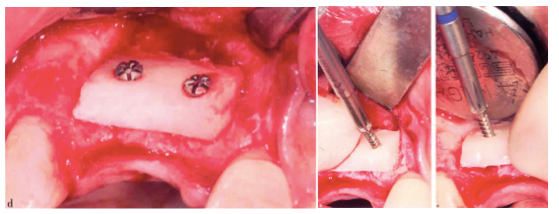 2、在植骨前需在移植骨块上预备螺丝通道,此通道直径应略大于固定钛钉的直径,以较少钛钉旋转就位时对骨块的受力,防止造成骨块的破坏;同时需要在受植床上预备螺丝通道,此通道的直径应略小于钛钉直径,预备深度小于固位深度,以保证钛钉就位后有足够的固位力,形成良好的固位稳定,此预备法也被称为有限预备。