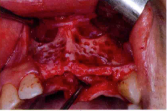必须实现无张力的初期创口关闭,通常,骨移植之后黏膜量不足,可在粘骨膜瓣基底部行骨膜切开,松弛粘骨膜瓣,使粘骨膜冠向推进,关闭创口。通常用4-0缝合线行褥式或单线间断缝合关闭创口。