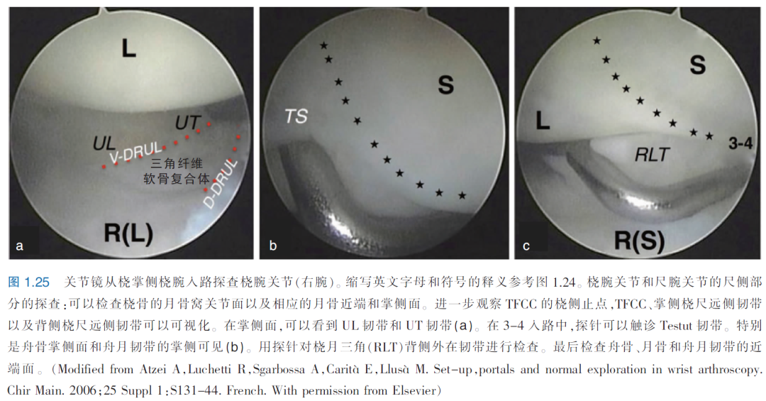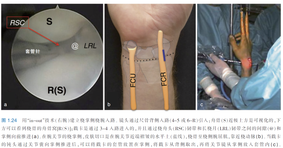 建立此入路的两种方法均被认为是安全的。第一种方法是所谓的in-out技术,其首先在尸体标本中被描述(图1.24):将镜头放置在尺骨入路(4-5或6-R),钝戳卡插入3-4入路,并朝桡腕关节囊前部推进。此后将其穿过RSC韧带和LRL韧带之间的关节囊,在桡侧腕屈肌旁的小皮肤切口离开。然后将套管安全地放置在戳卡上,再将关节镜从掌侧插入桡腕关节。