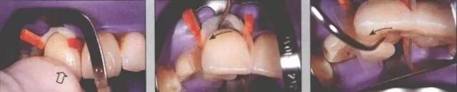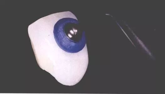 与嵌体一样,需要找一个器械来拿取修复体,通常将带有粘蜡的充填器固定于瓷贴面的唇侧,一定要小心谨慎,一面修复体脱落。