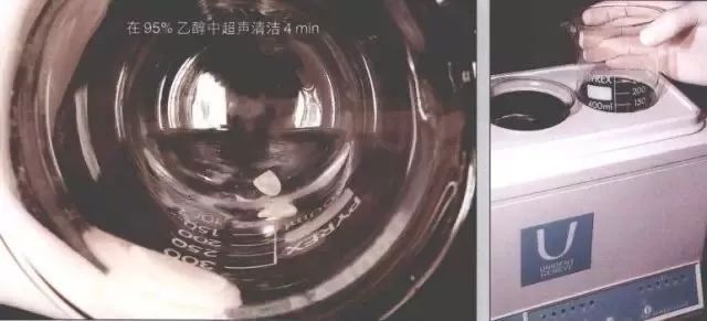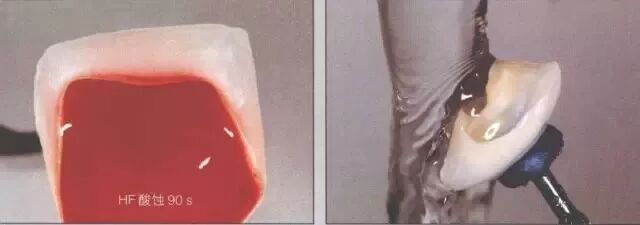 建议使用10%的氢氟酸酸蚀修复体内表面90秒,目的是形成微孔,与粘接剂之间形成微机械固位。然后使用大量清水清洗,但仅仅用水冲洗是不够的,表面还有一些看不见的污染物残留。将冲洗后的修复体放入95%的乙醇或丙酮中,放入平时清洗器械的超声容器内,超声清洗4——5分钟,完全去除瓷贴面表面的残留物和再矿化盐分。