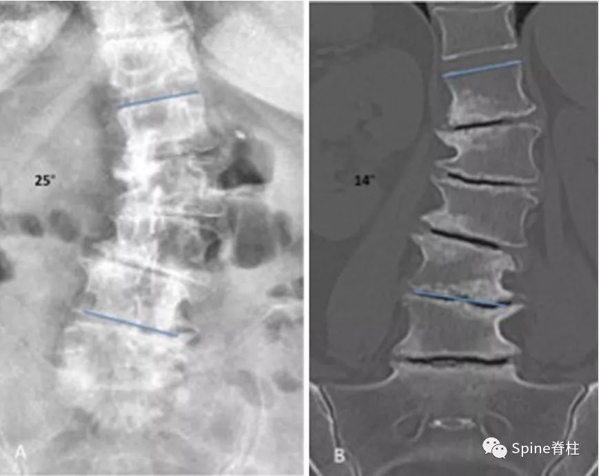 图: 典型的手风琴现象左图为站立位X线片,右图为仰卧位CT。站立位负重时的椎间盘与仰卧位(不负重)椎间盘塌陷程度不同,且侧凸角度也不同(分别为25°和14°)