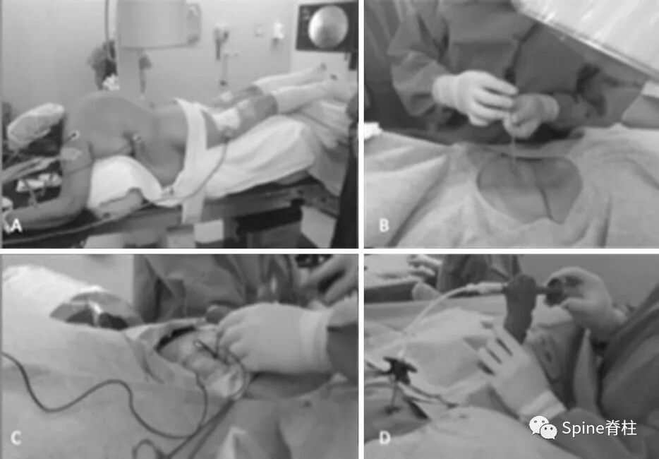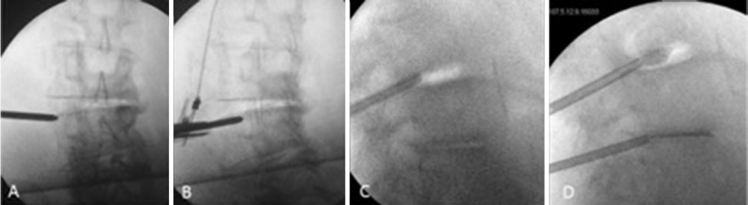 图: A: 俯卧位,髋关节伸展,以增加腰椎前凸和椎间盘间隙; B: 经皮透视下放置Jamshidi针; C: 在肌电图监护下穿刺并注射; D: 缓慢注射骨水泥